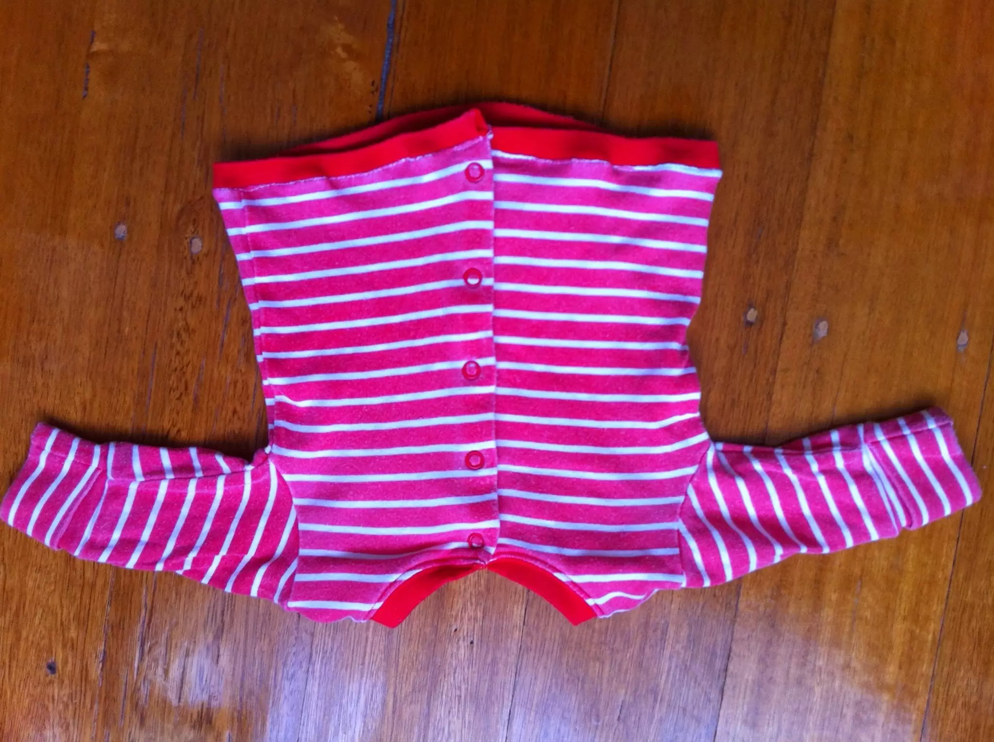 Pickle has long legs and is slender so her feet would start to get snug while the rest of the onesie fit. I just sewed a bit of T-shirt collar on the bottom of the top for length rather than hemming. I can’t tell you how much easier it is to button up a top instead of pulling it over a small wriggly person’s head.